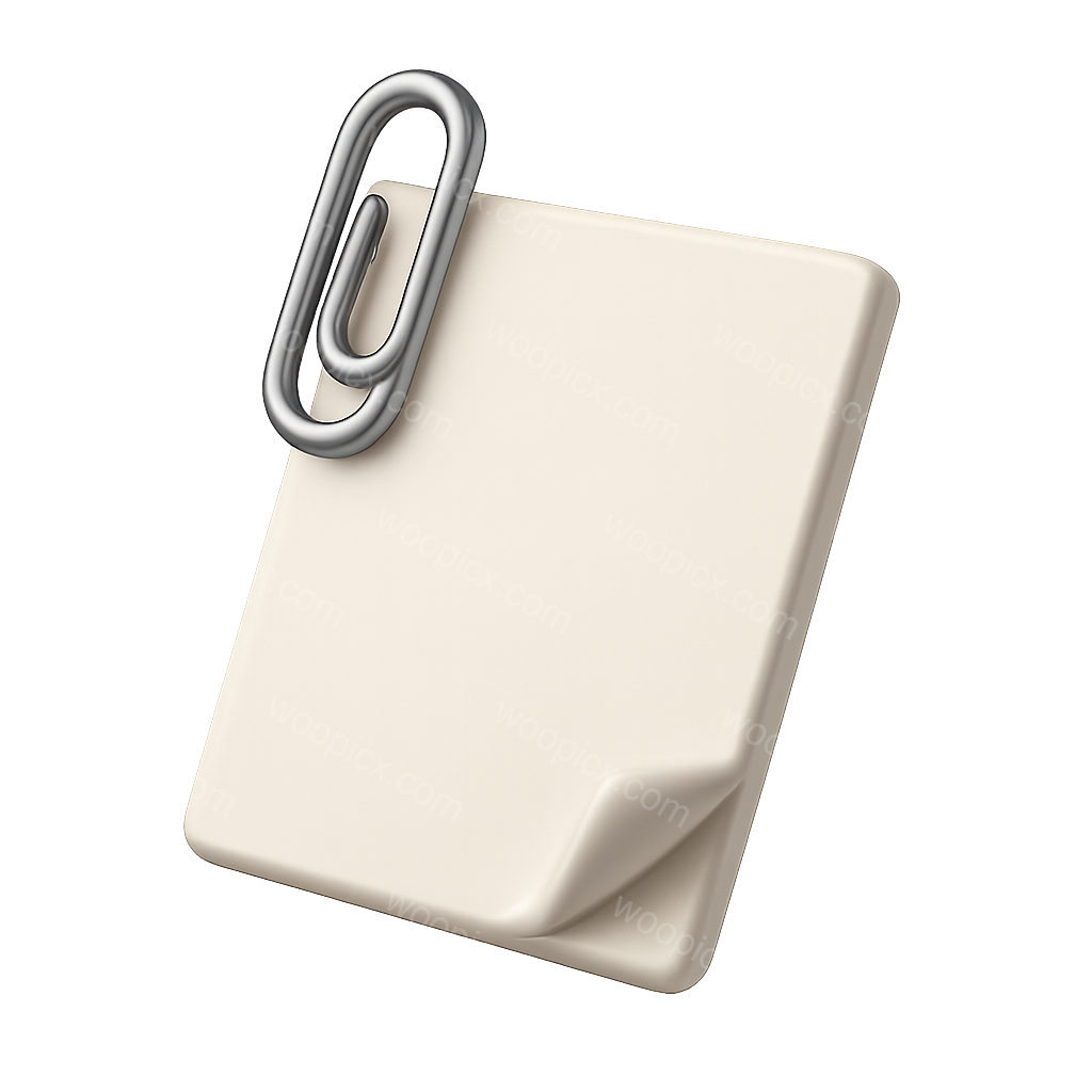 /Premium/Collection: /by davooda/Type: PNG/A 3D rendering of a paper sheet with a metallic paperclip attached, presented in an isometric view. The design features a smooth, volumetric appearance against a soft gradient background.