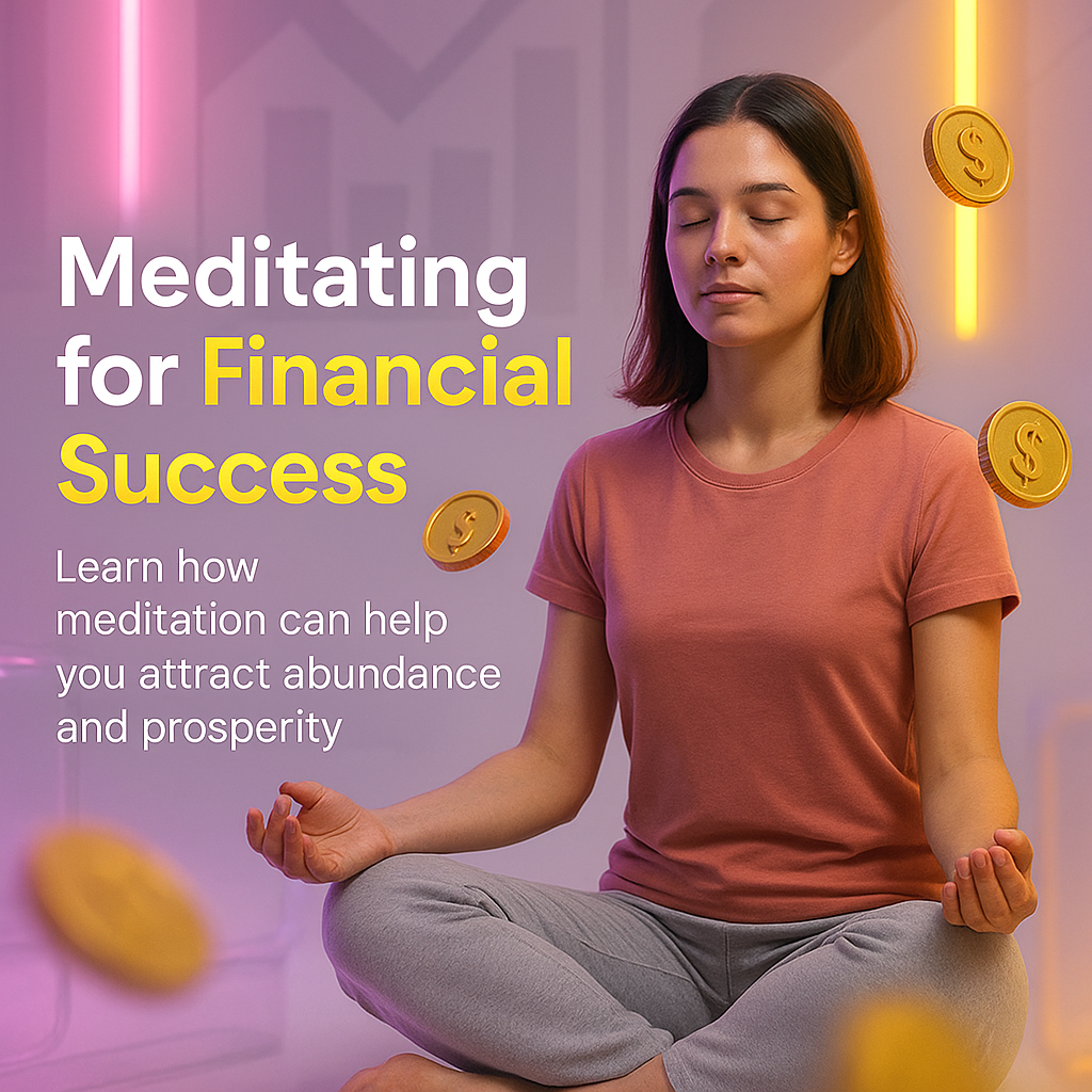 Engaging promotional graphic featuring a woman meditating with floating coins, highlighting the benefits of meditation for financial success. Ideal for wellness and financial growth marketing.