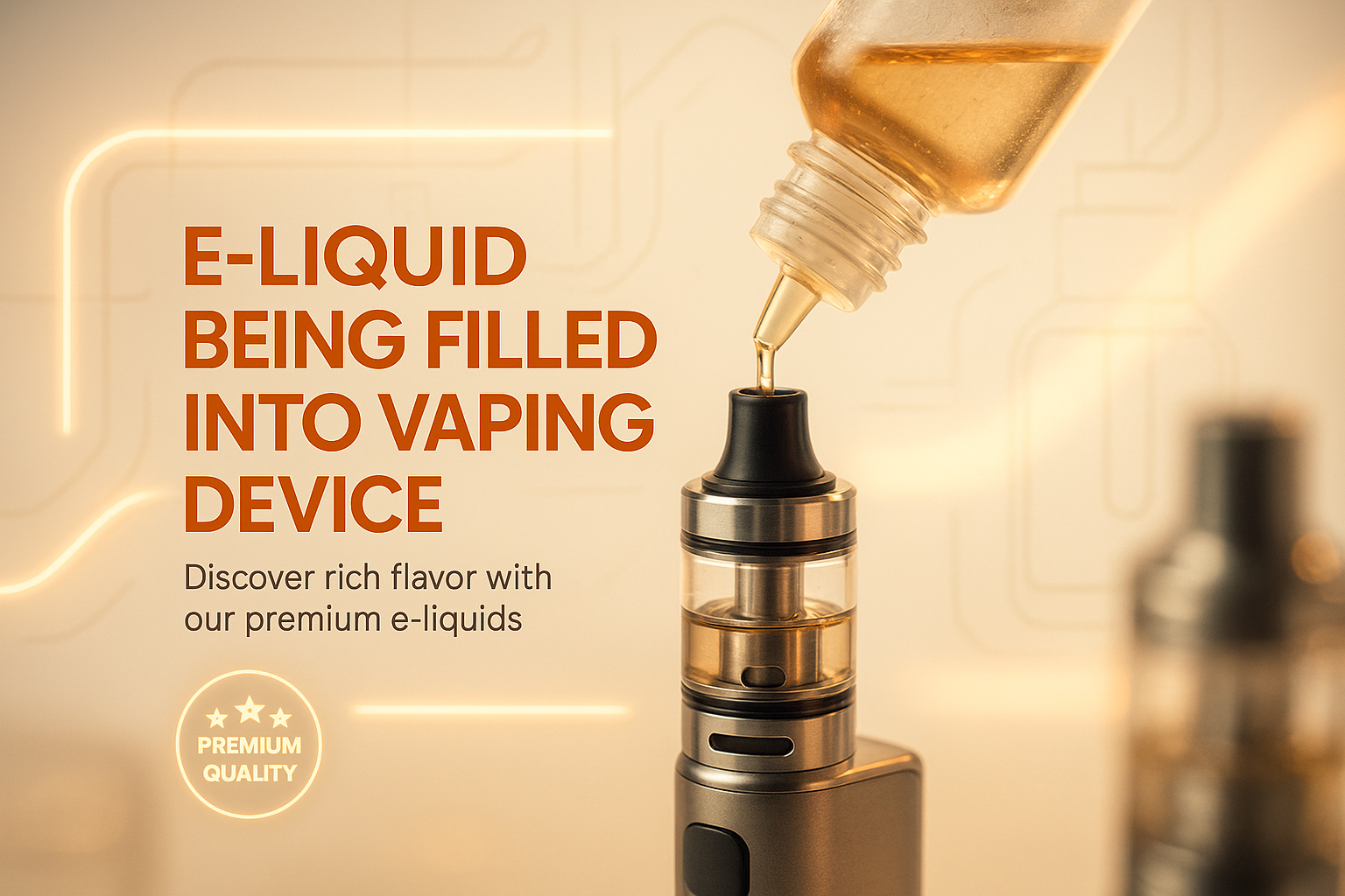 Close-up image showcasing the process of filling a vaping device with e-liquid, emphasizing premium quality and rich flavor, ideal for vaping enthusiasts.