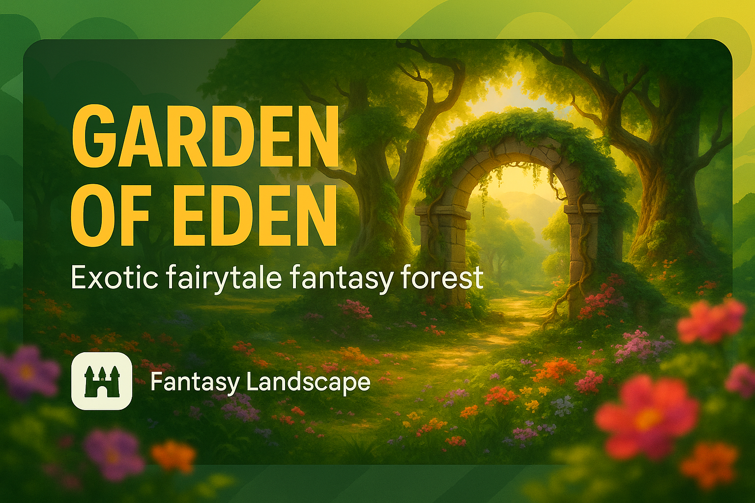 Vibrant fantasy landscape depicting a magical garden with lush greenery and colorful flowers, ideal for storytelling or creative projects.