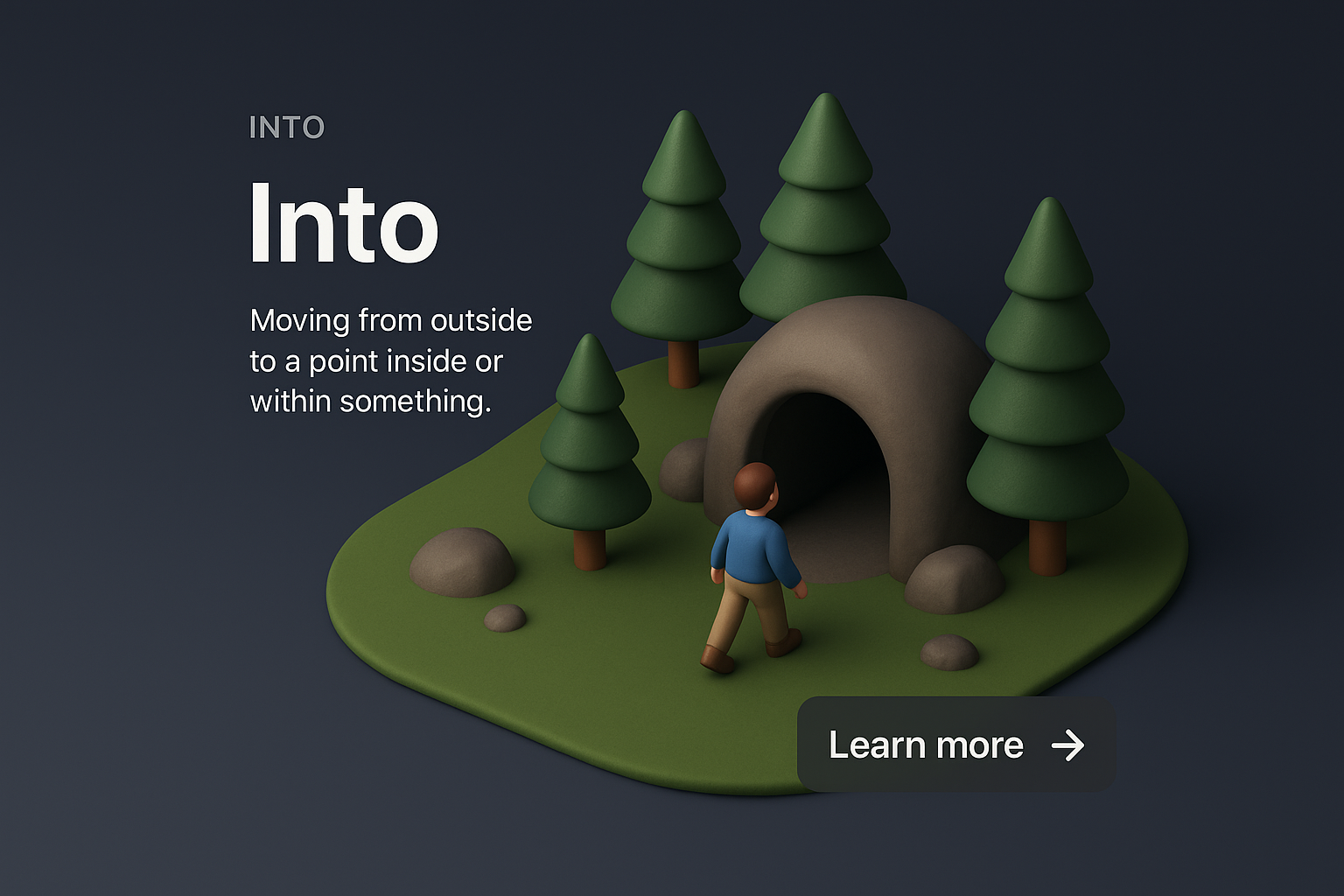 A visually appealing 3D scene featuring a character approaching a cave entrance surrounded by trees and rocks, set against a dark gradient background.