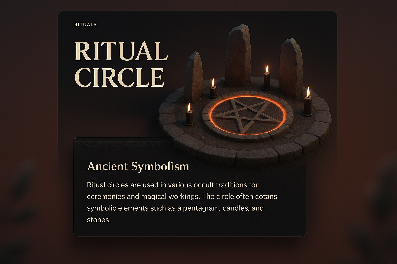 /Collection: /by davooda/Type: PNG/A detailed 3D illustration of a ritual circle featuring candles, stones, and a pentagram. The design includes a dark overlay with text blocks, enhancing the mystical theme.