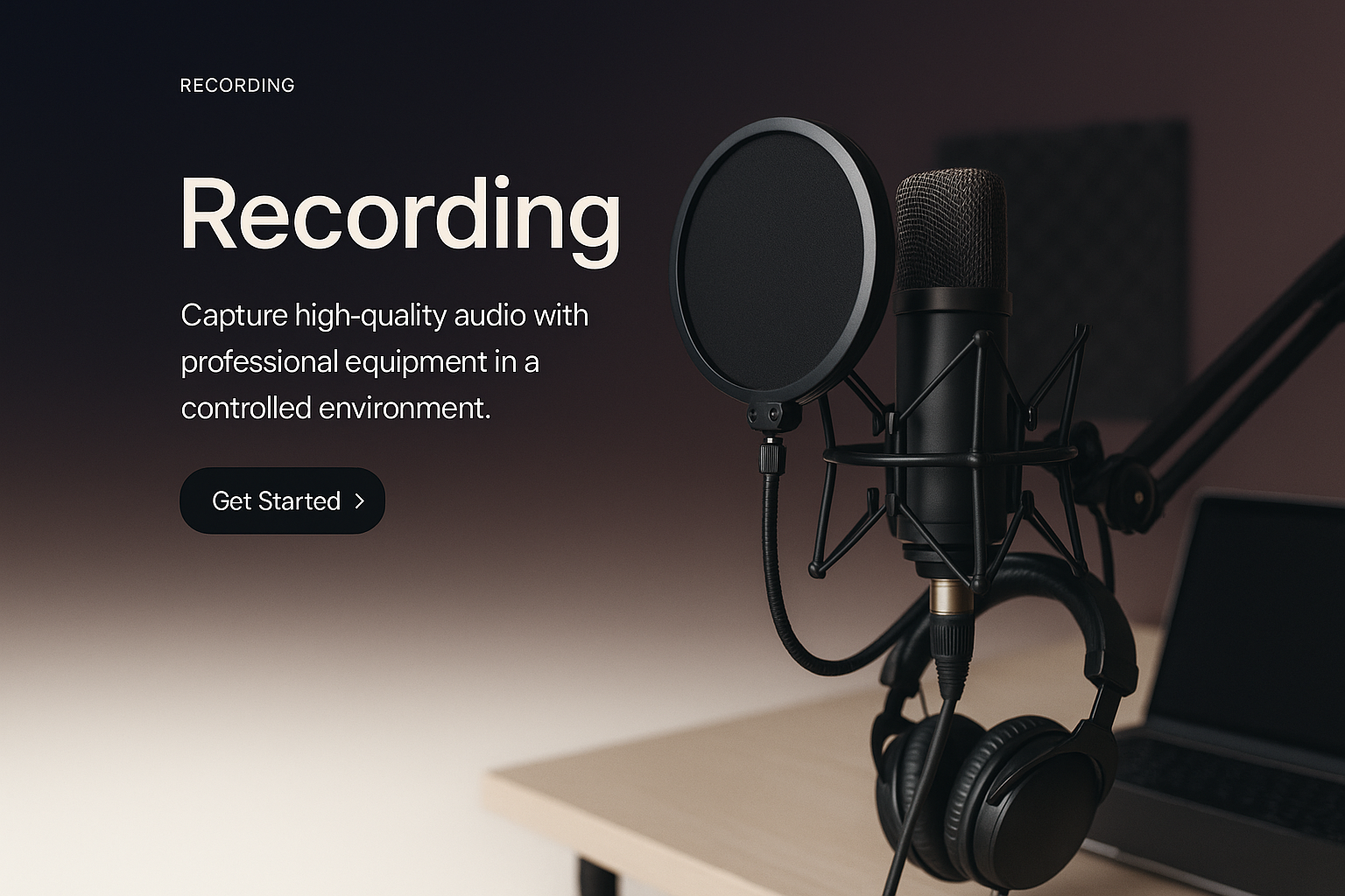 /Collection: /by davooda/Type: PNG/A stylish web page design featuring a microphone and headphones, promoting audio recording services. The design includes a gradient background and clear text elements.