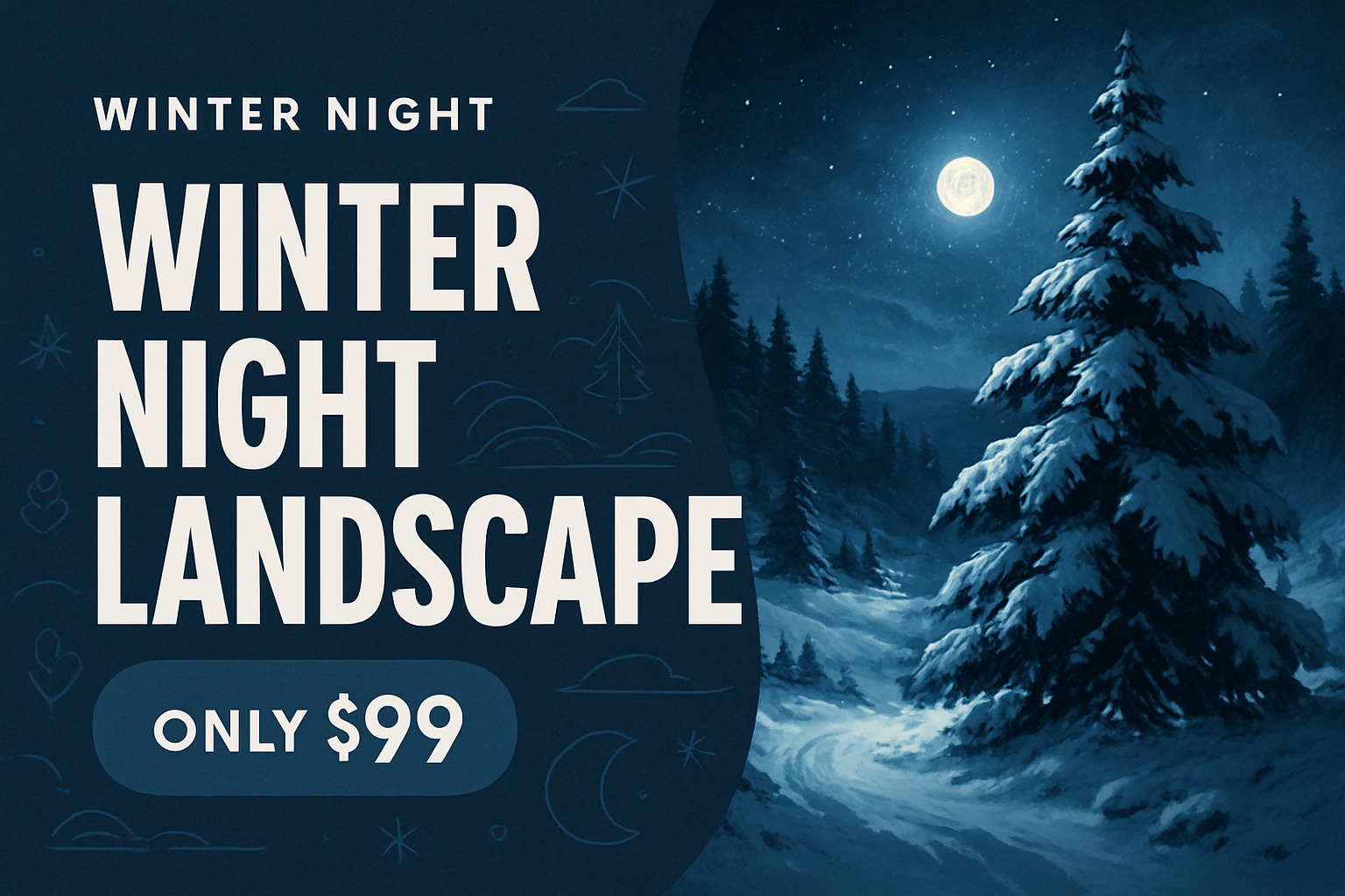 /Collection: /by davooda/Type: PNG/A captivating winter night landscape featuring a snow-covered scene under a full moon. The advertisement showcases bold typography, clean layout, and a contrasting background, creating an energetic appeal.