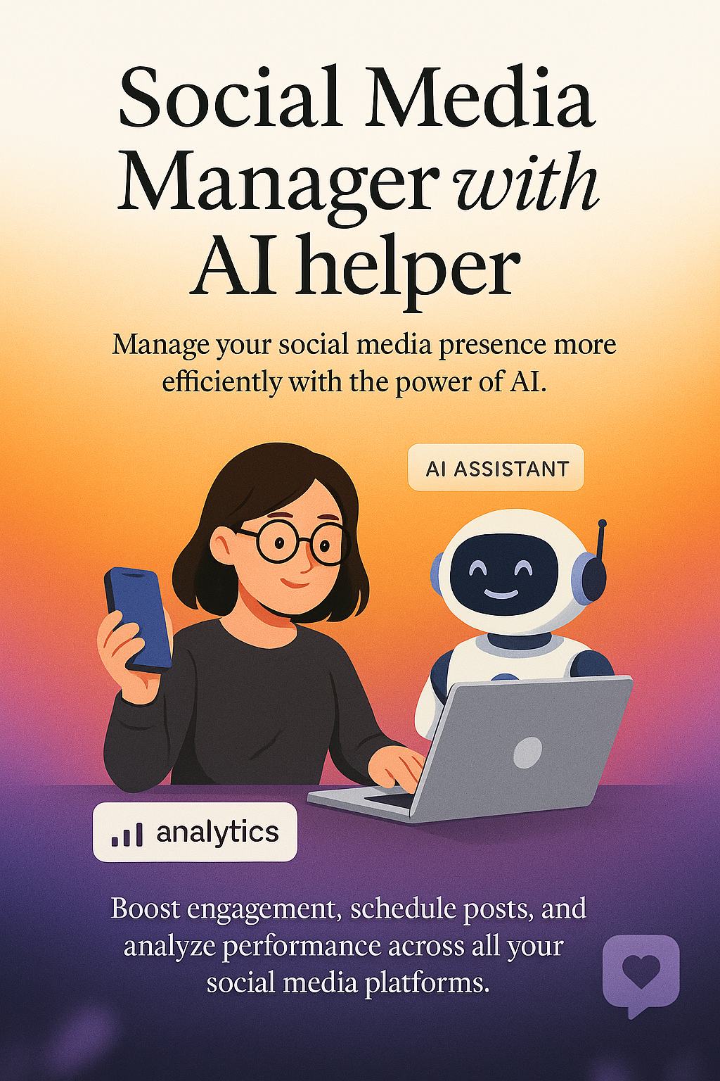 /Collection: /by davooda/Type: PNG/A vibrant illustration showcasing a Social Media Manager using an AI helper. The design features a gradient background, engaging text, and visual elements that enhance the theme of efficiency in social media management.