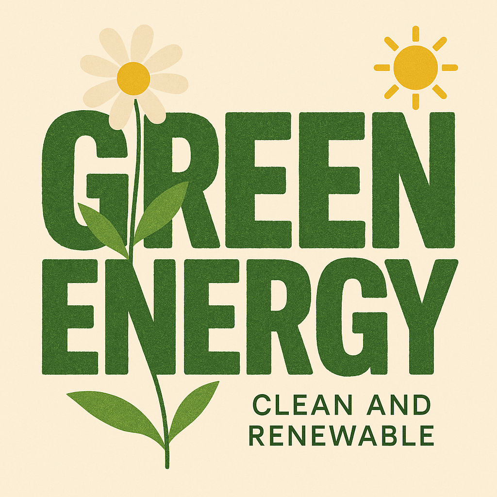Stylized graphic promoting green energy, featuring bold typography and floral elements. Ideal for environmental campaigns or educational materials.