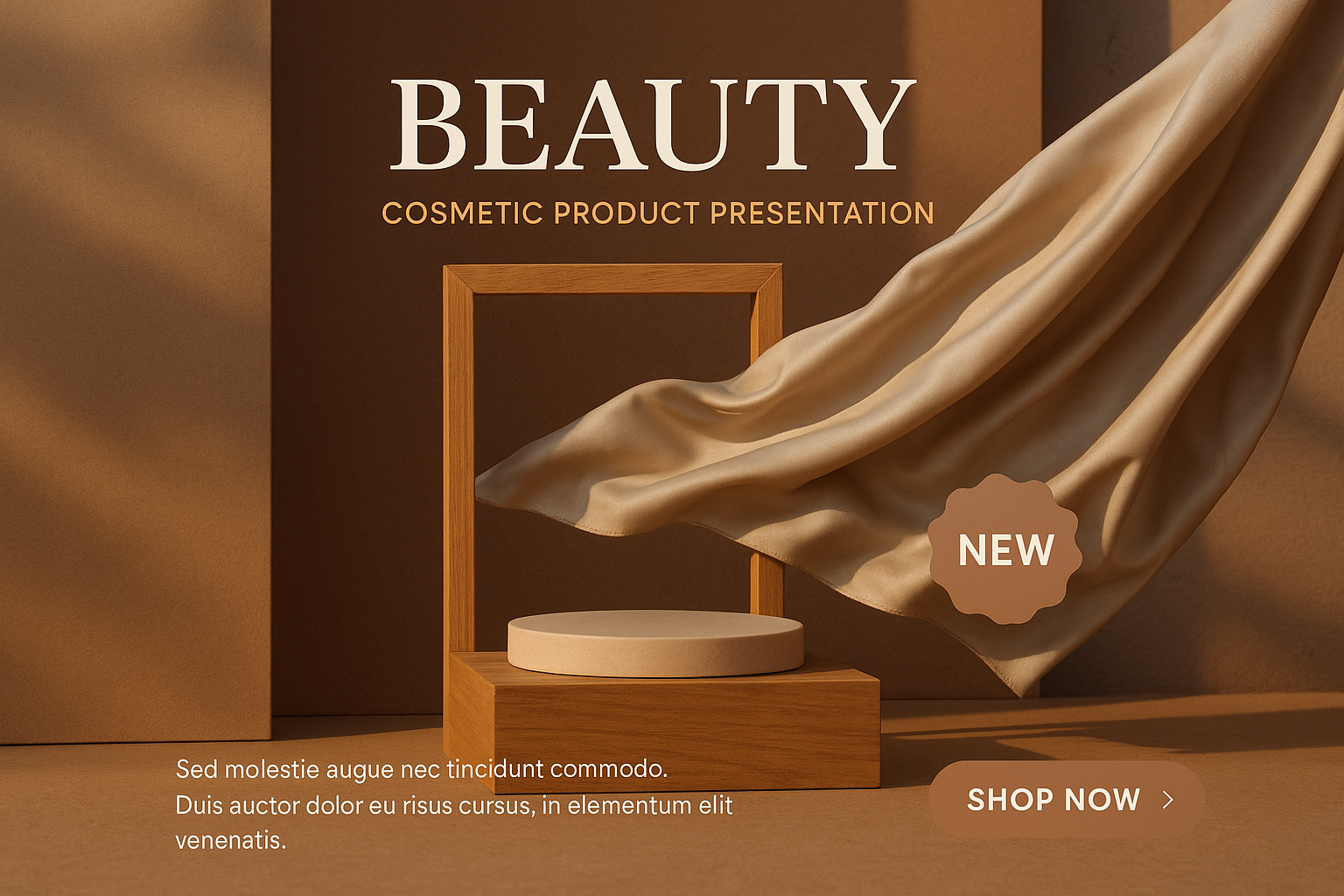 A realistic 3D render featuring a wooden podium with a silk curtain, showcasing a beauty product presentation. The composition emphasizes elegance and sophistication.