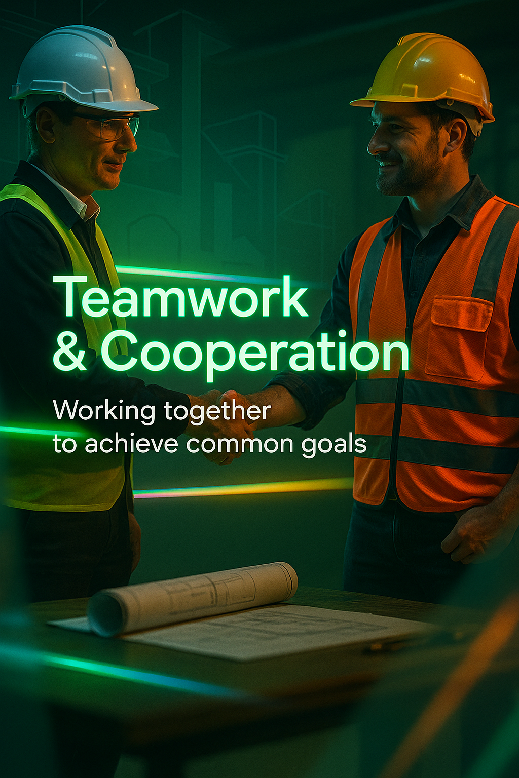 /Collection: /by davooda/Type: PNG/A visually engaging image depicting professionals in safety gear collaborating, emphasizing teamwork and cooperation. Ideal for corporate training or motivational content.