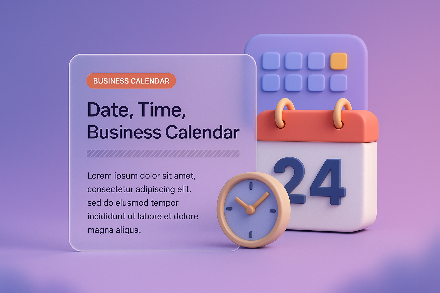 A visually engaging 3D illustration featuring a business calendar, clock, and gradient background. The design emphasizes clarity and modern aesthetics.