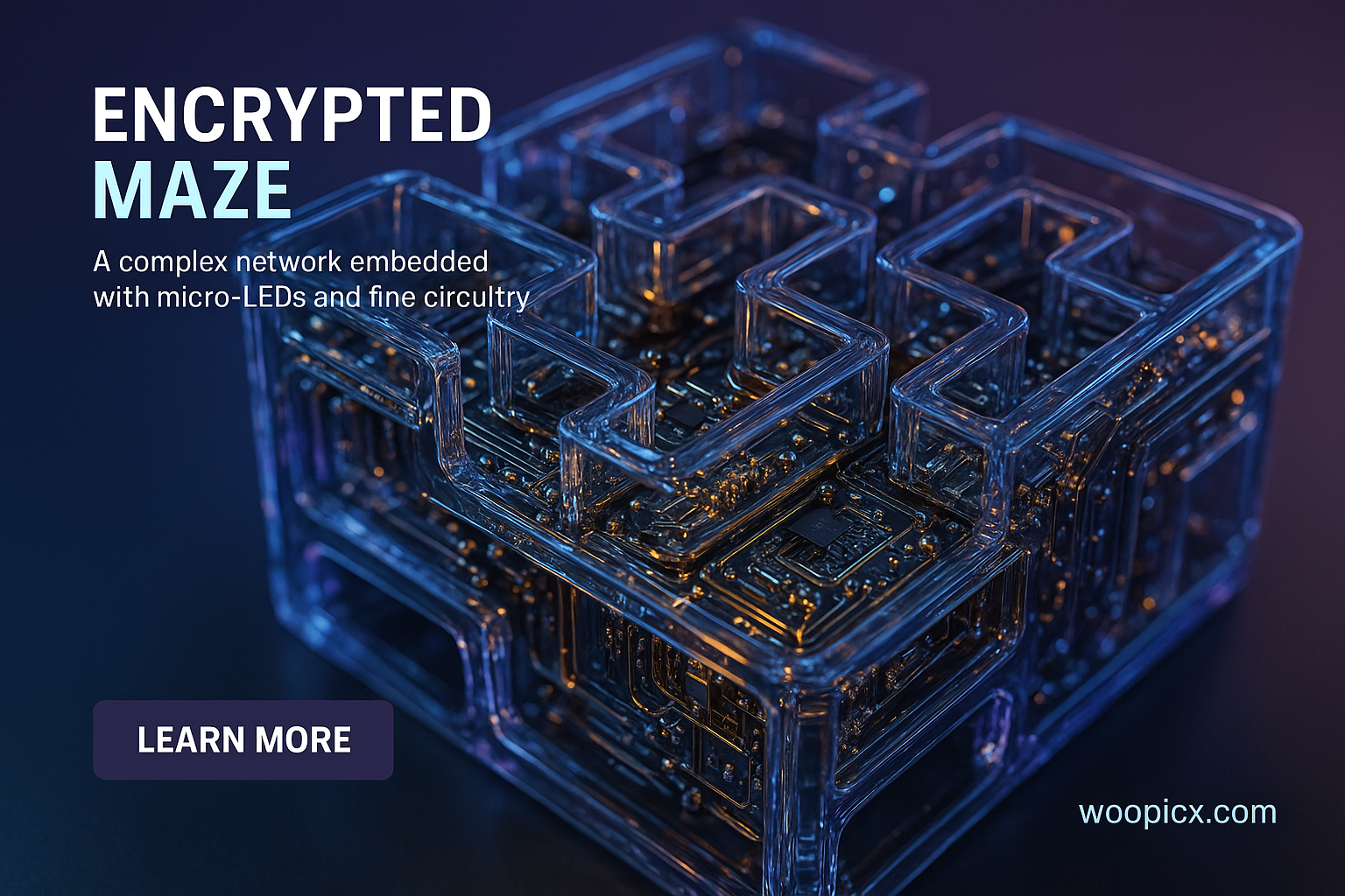 /Collection: /by davooda/Type: PNG/A hyperrealistic 3D depiction of an encrypted maze, featuring translucent materials and intricate micro-LEDs. The scene showcases glowing circuits and a sophisticated aesthetic with reflections.