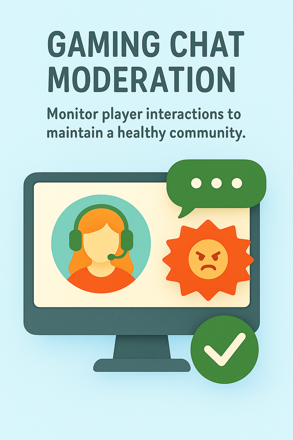 /Collection: /by davooda/Type: PNG/Illustrative graphic representing gaming chat moderation with a computer screen, featuring a moderator, emojis, and communication elements. Ideal for gaming community guidelines.
