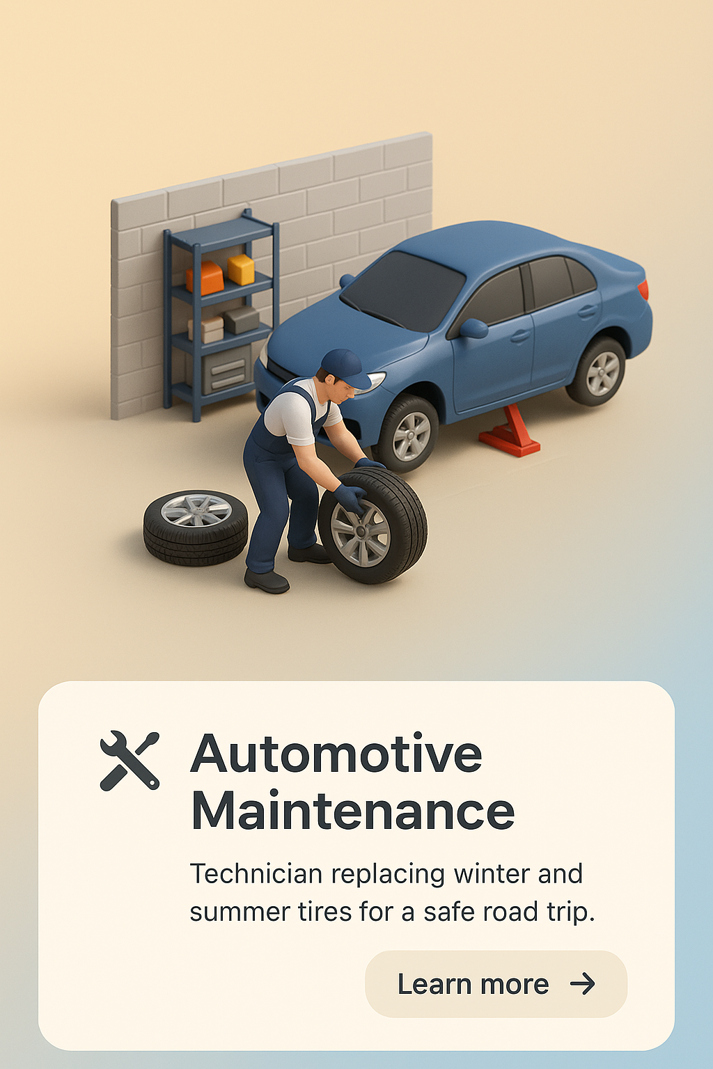 /Collection: /by davooda/Type: PNG/A 3D scene depicting a technician at a garage replacing winter and summer tires. The background features a gradient and minimal details, emphasizing automotive maintenance.