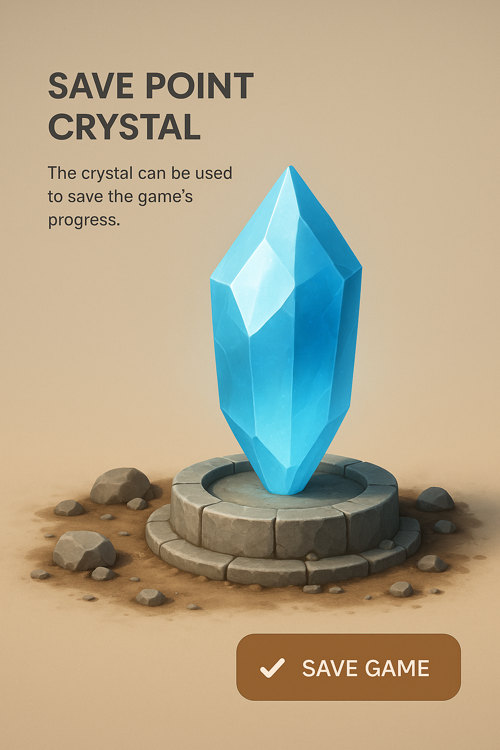 A detailed 3D illustration of a save point crystal, featuring a smooth gradient background and a clear action button. The scene is zoomed out to capture the entire context with a subtle, cohesive design.