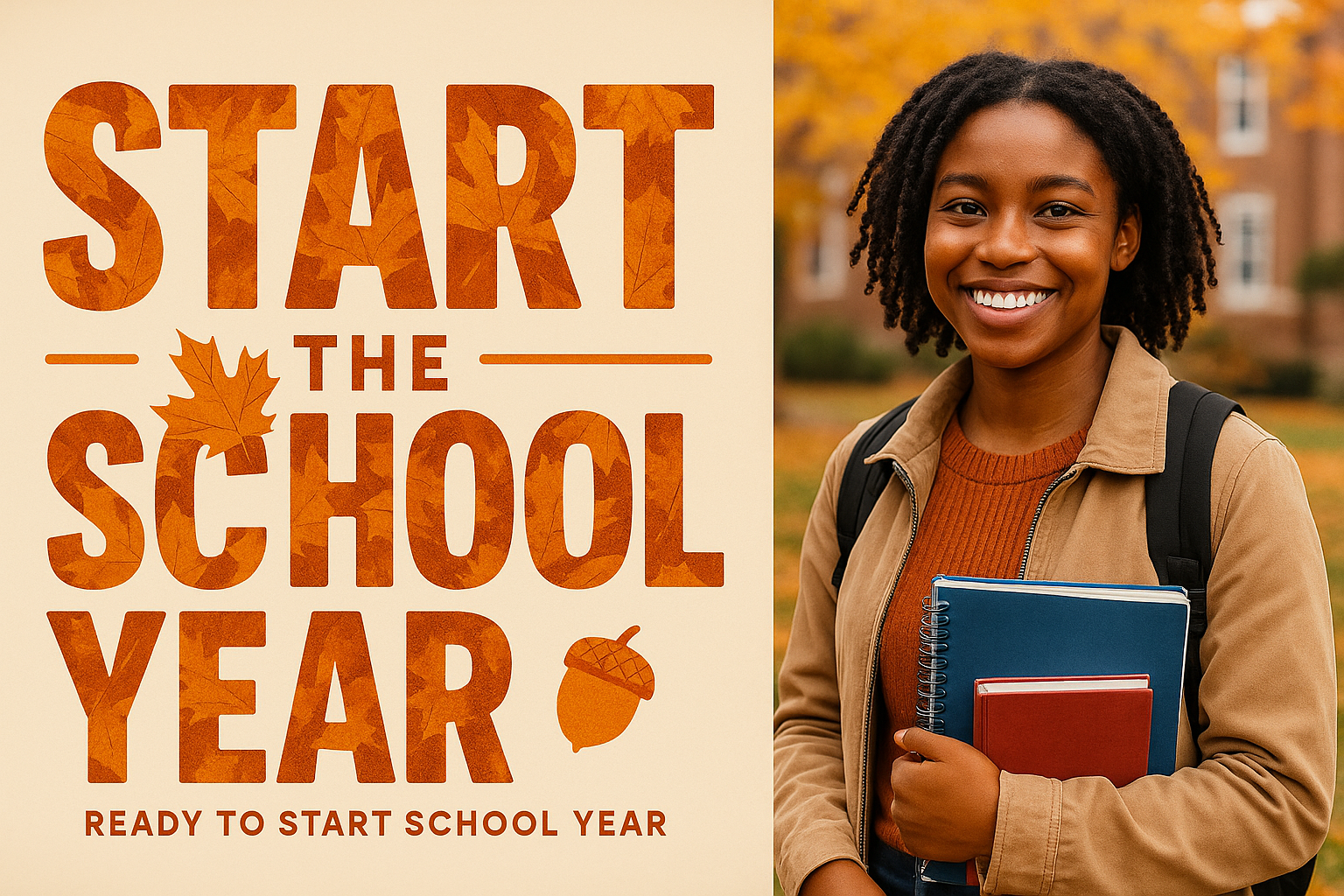 /Collection: /by davooda/Type: PNG/Engaging promotional image for back-to-school season featuring a smiling student holding books, set against a warm autumn backdrop. Ideal for educational campaigns.