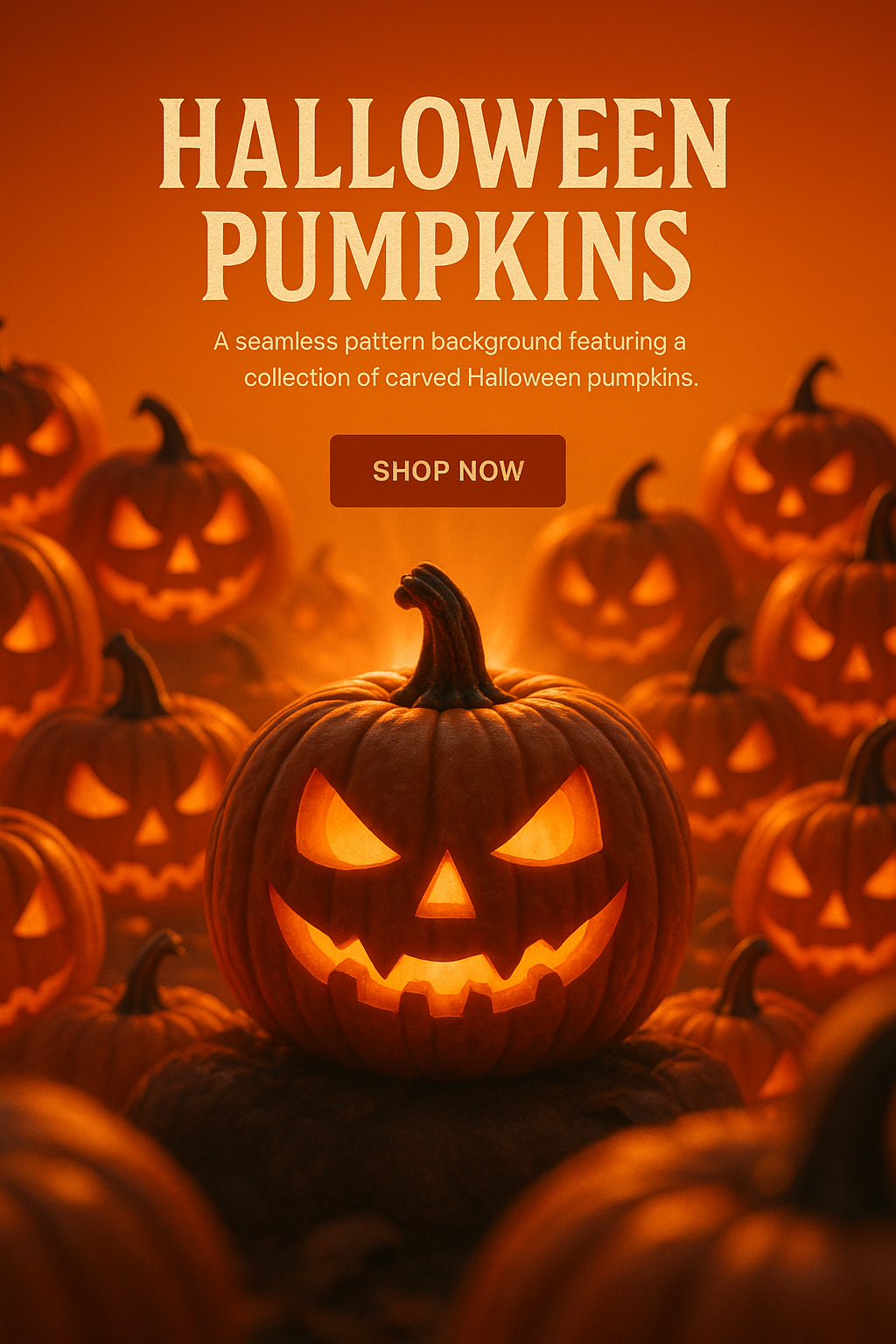 This image features a vibrant Halloween-themed background showcasing a collection of carved pumpkins. Ideal for seasonal promotions or festive designs.