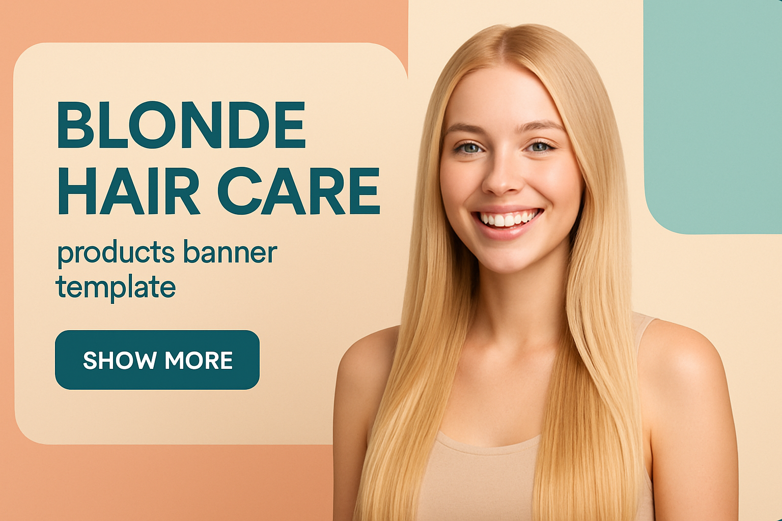 Blonde Haircare Banner with Smiling Woman and Bold Typography