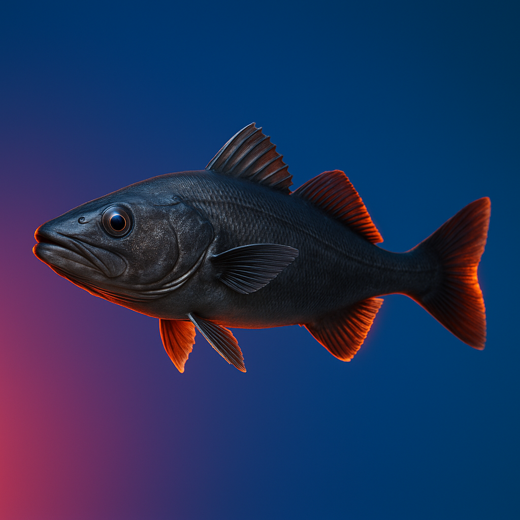 /Collection: /by davooda/Type: PNG/A stunning realistic portrayal of a black cod fish, illuminated from both front and back. The fish is set against a smooth gradient background, highlighting its features with vibrant contrasting colors.