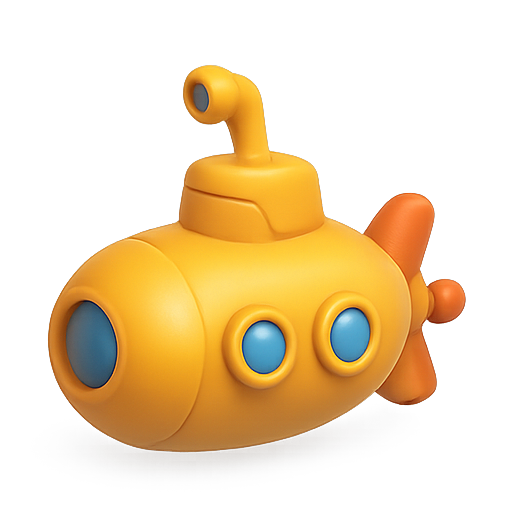 A vibrant and playful cartoon-style submarine toy featuring a bright yellow body with blue windows and an orange propeller, ideal for children's toys or educational materials.