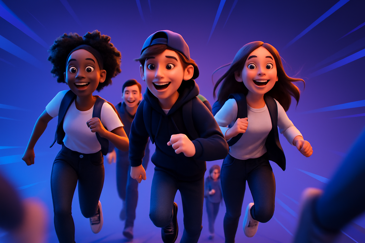 /Collection: /by davooda/Type: PNG/A vibrant 3D illustration showing a group of diverse students joyfully walking to school. The dynamic composition features a smooth gradient background and lively expressions.
