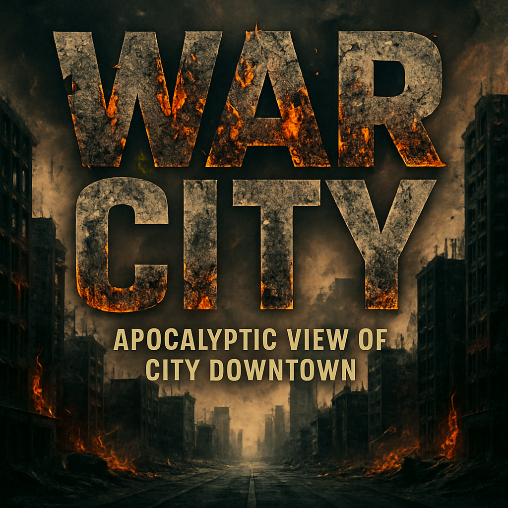 Striking graphic depicting a war-torn city skyline with fiery destruction, ideal for themes of dystopia or gaming. Captivating visual style for promotional material.