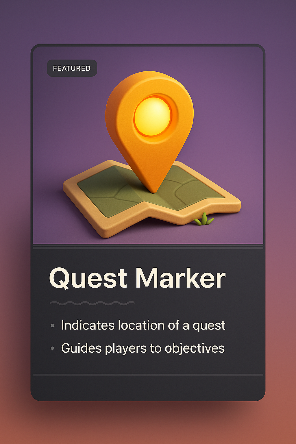 A vibrant 3D illustration of a quest marker on a map, featuring a smooth gradient background. It highlights essential information while maintaining a cohesive design.