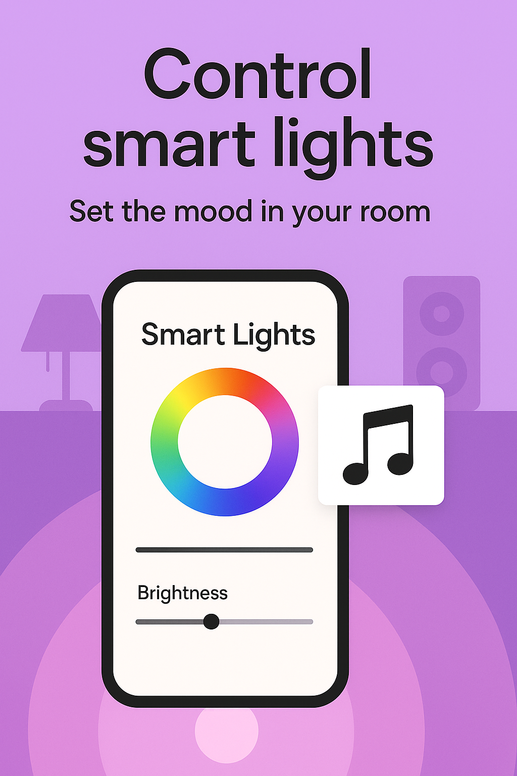 Modern graphic showcasing a user interface for controlling smart lights, featuring a color wheel and brightness slider, ideal for tech product marketing.