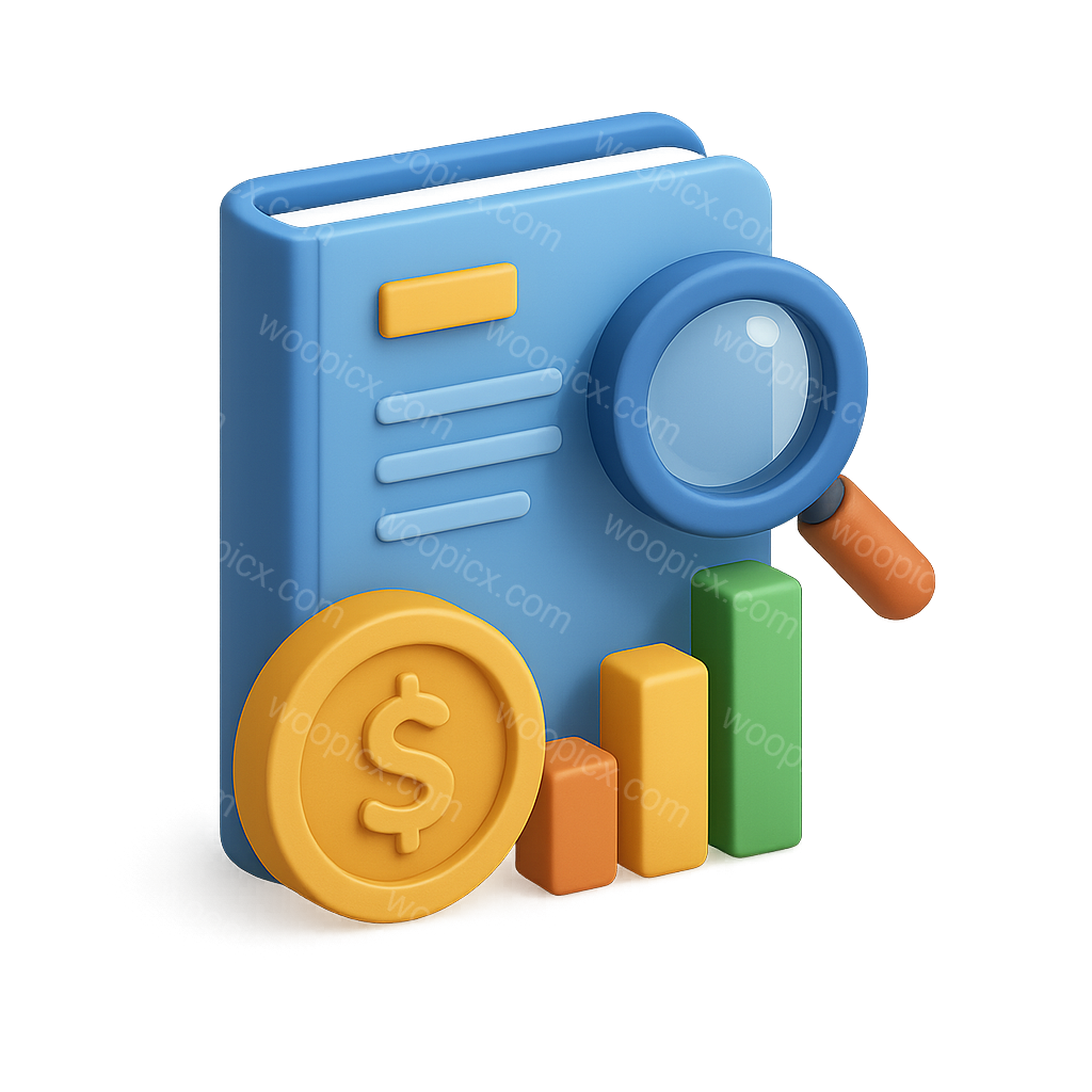 /Premium/Collection: /by davooda/Type: PNG/A vibrant 3D icon representing asset management, featuring a book, a magnifying glass, and colorful bar graphs alongside a dollar sign, all in a three-quarter isometric view.