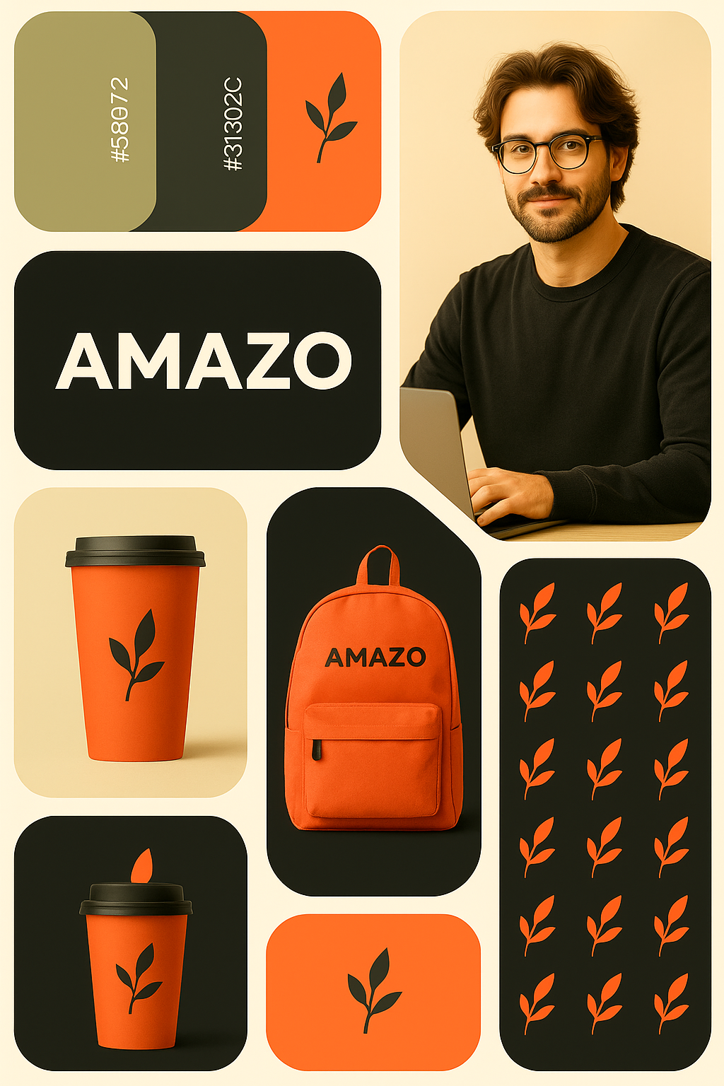 /Collection: /by davooda/Type: PNG/The image features a creative layout of design blocks showcasing a modern branding concept. It includes elements like a coffee cup, backpack, and a person working on a laptop, all with a cohesive color scheme.