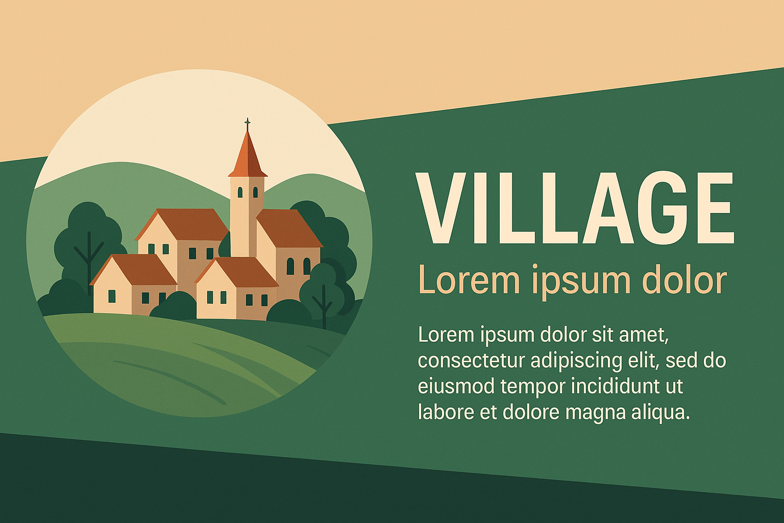 A visually appealing design featuring a geometric village scene with layered composition. The gradient background enhances the main elements, creating a professional and engaging aesthetic.