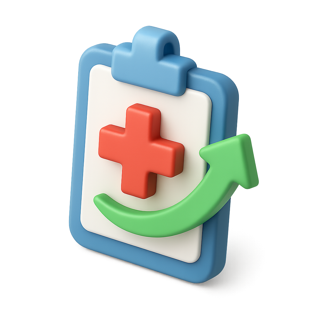 A vibrant 3D recovery icon featuring a clipboard with a red cross and a green arrow, designed in an isometric style with a transparent background.
