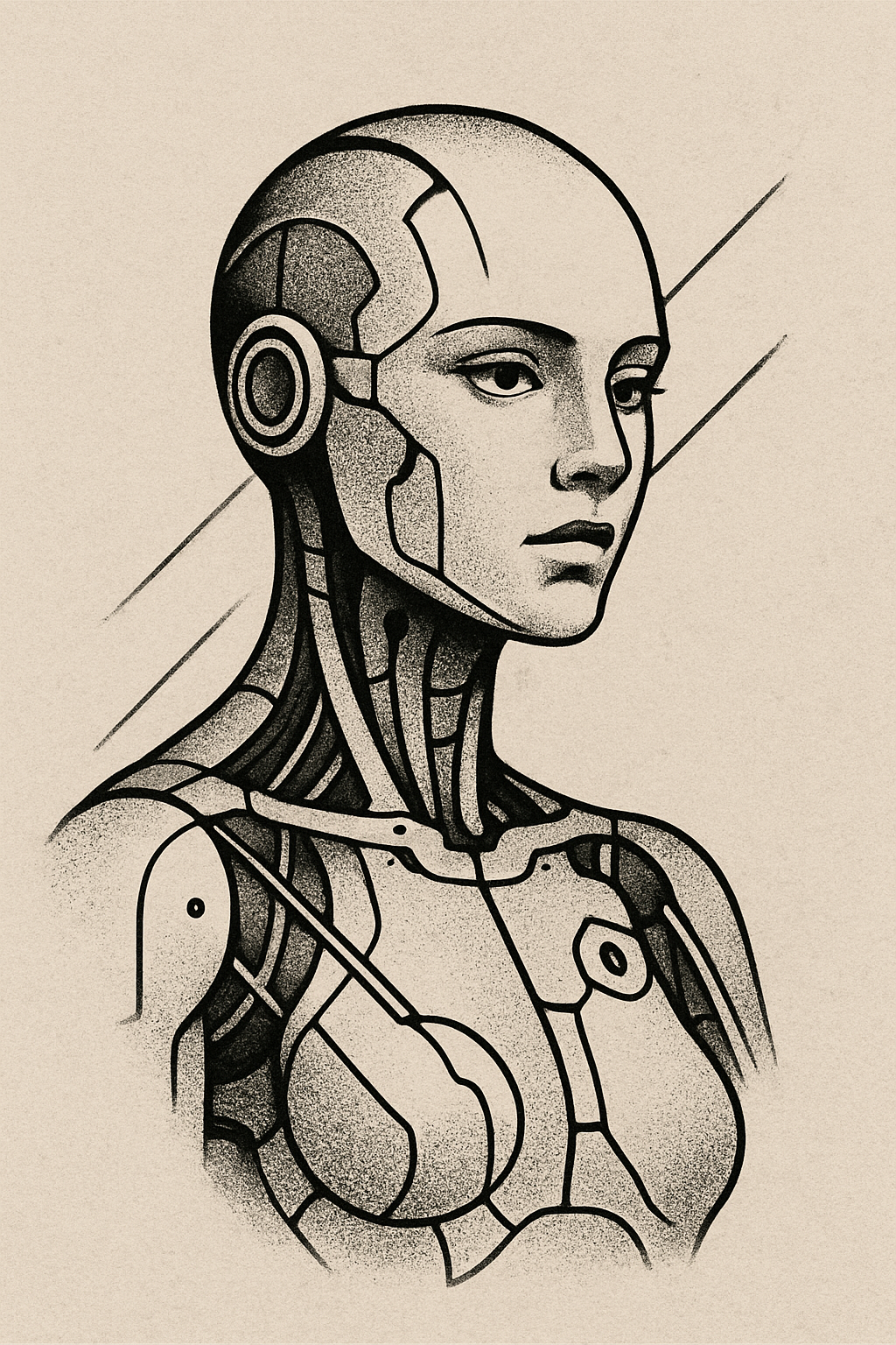 Stylized robotic portrait with intricate line work