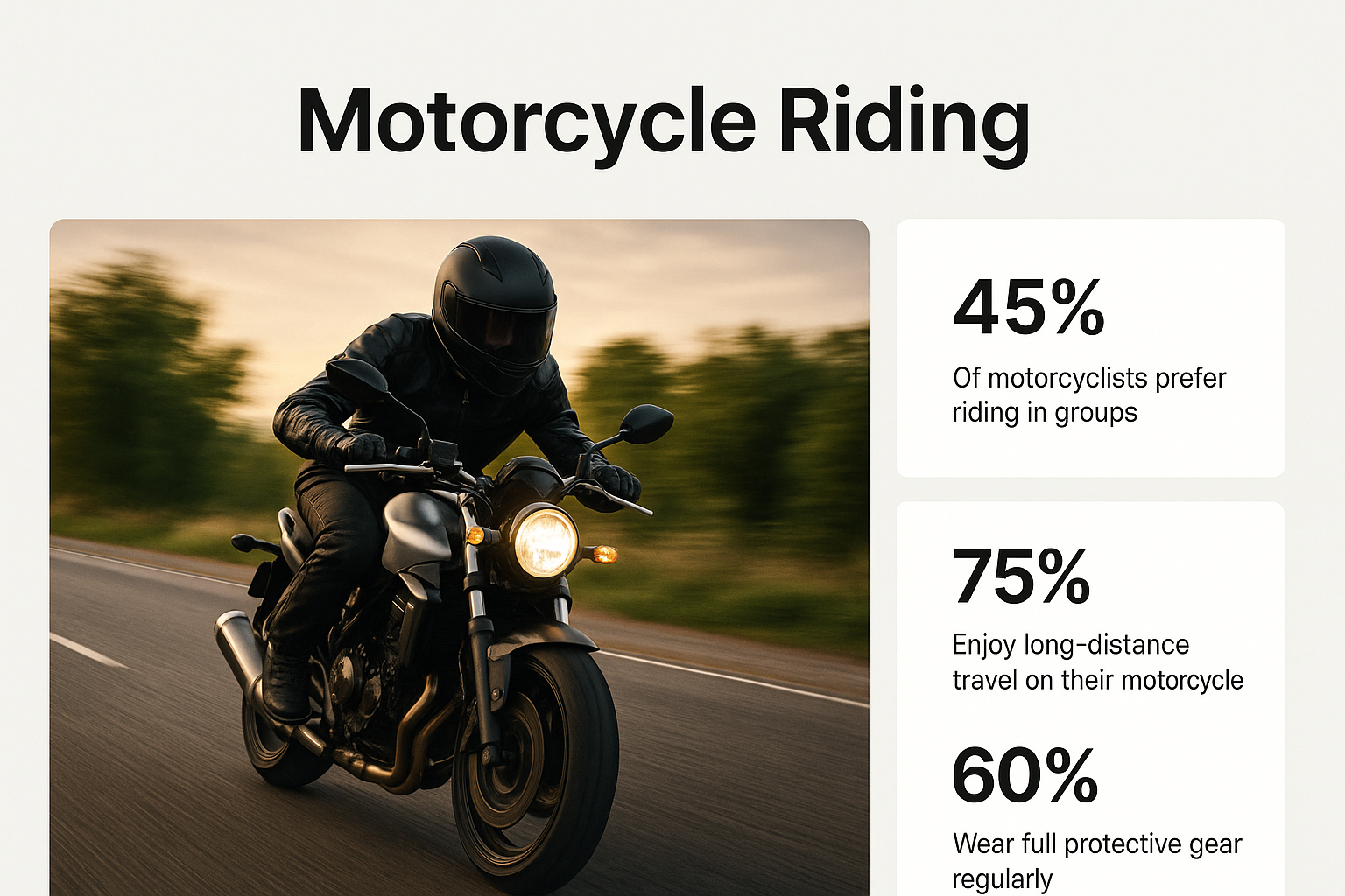 Engaging infographic presenting statistics about motorcycle riding preferences and habits, featuring a dynamic image of a rider in action.