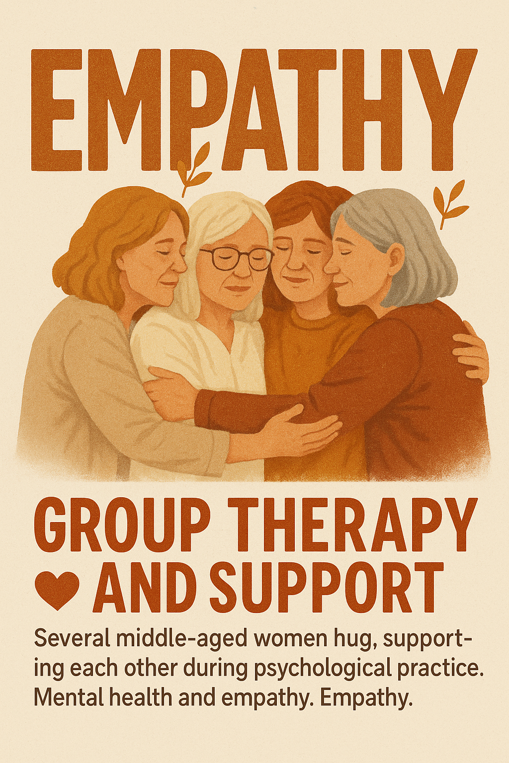 /Collection: /by davooda/Type: PNG/Illustrative image depicting middle-aged women hugging, symbolizing support and empathy in group therapy. Suitable for mental health advocacy and community support campaigns.