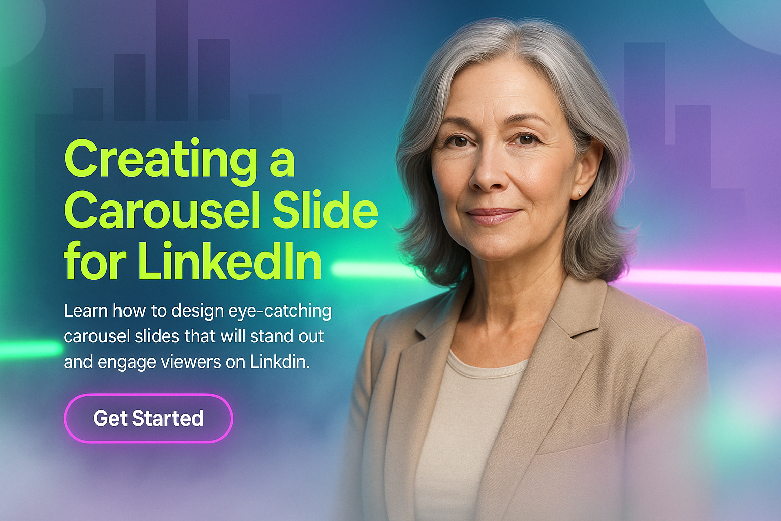 Engaging promotional image for a tutorial on creating LinkedIn carousel slides, featuring a confident professional and vibrant design elements suitable for social media marketing.
