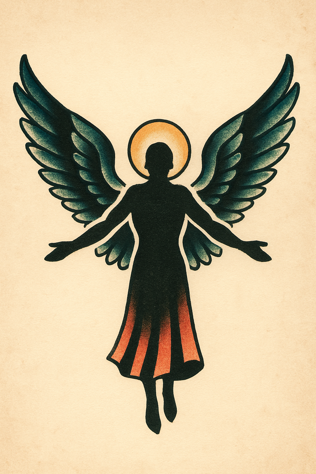 This image features a striking tattoo design of a silhouette with shadowy wings, set against a soft beige background. The wings are colorful, enhancing the ethereal feel.