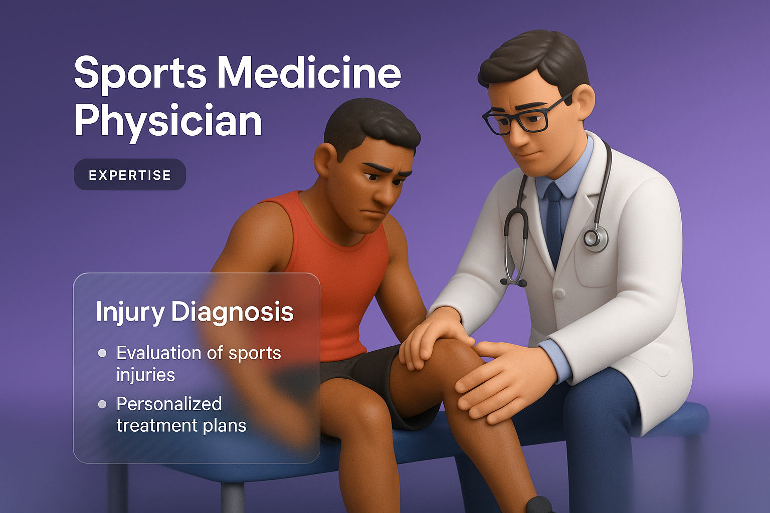 /Collection: /by davooda/Type: PNG/A 3D illustration featuring a sports medicine physician examining a patient. The design integrates text elements and a smooth gradient background, creating a professional and informative visual.