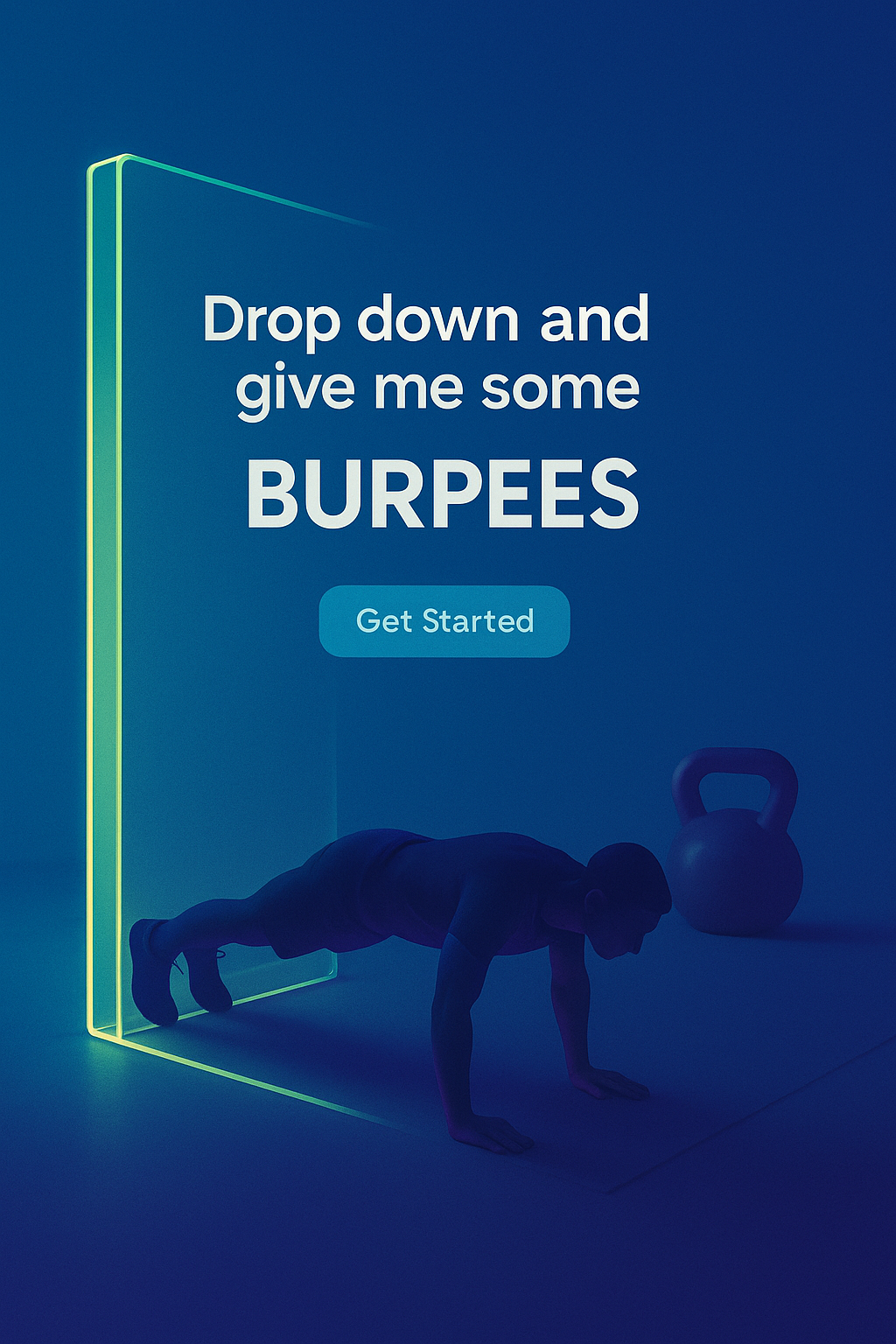 /Collection: /by davooda/Type: PNG/A workout scene featuring a person performing burpees in shadow, accentuated by glowing neon lines and a semi-transparent glass structure. The vibrant colors create a dynamic atmosphere.