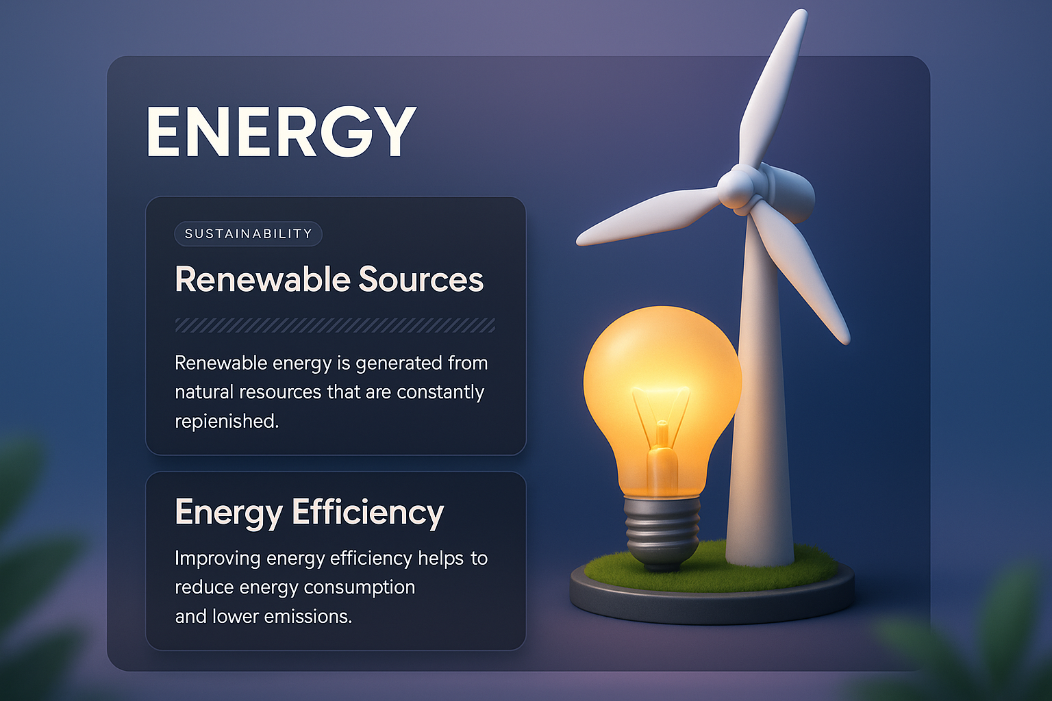 /Collection: /by davooda/Type: PNG/A visually engaging 3D illustration featuring a wind turbine and a glowing light bulb, emphasizing renewable energy and sustainability. The design includes informative text blocks integrated seamlessly.