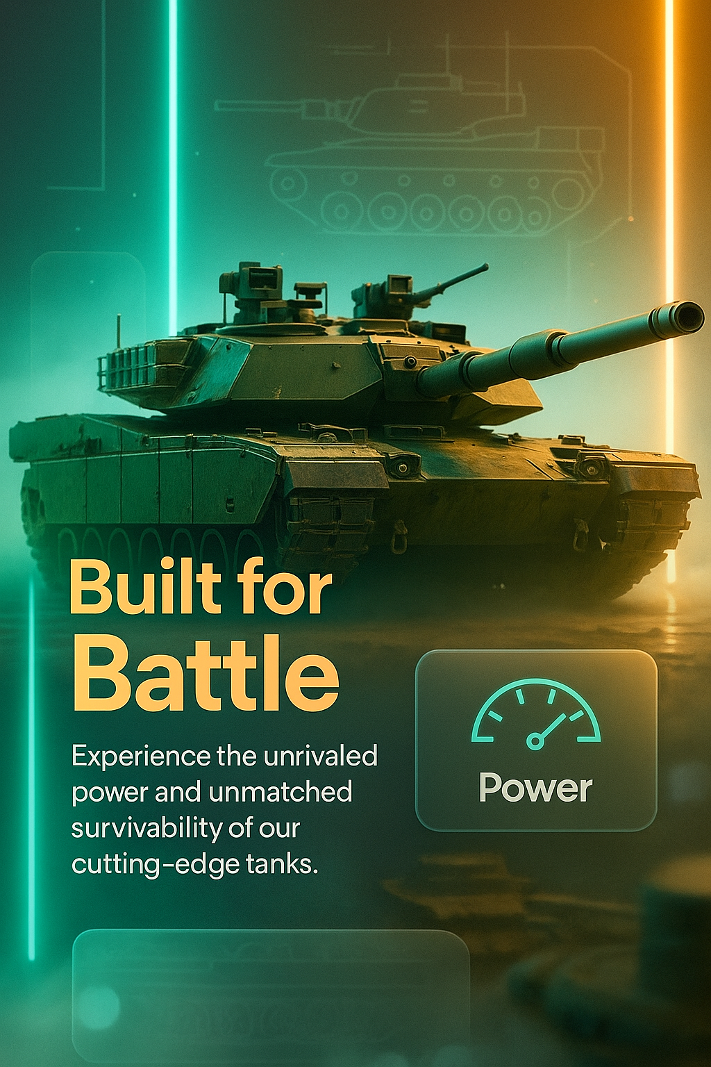 /Collection: /by davooda/Type: PNG/A striking carousel slide design featuring a realistic tank with neon accents. The layered composition includes a bold headline, a description, and visual elements for depth.