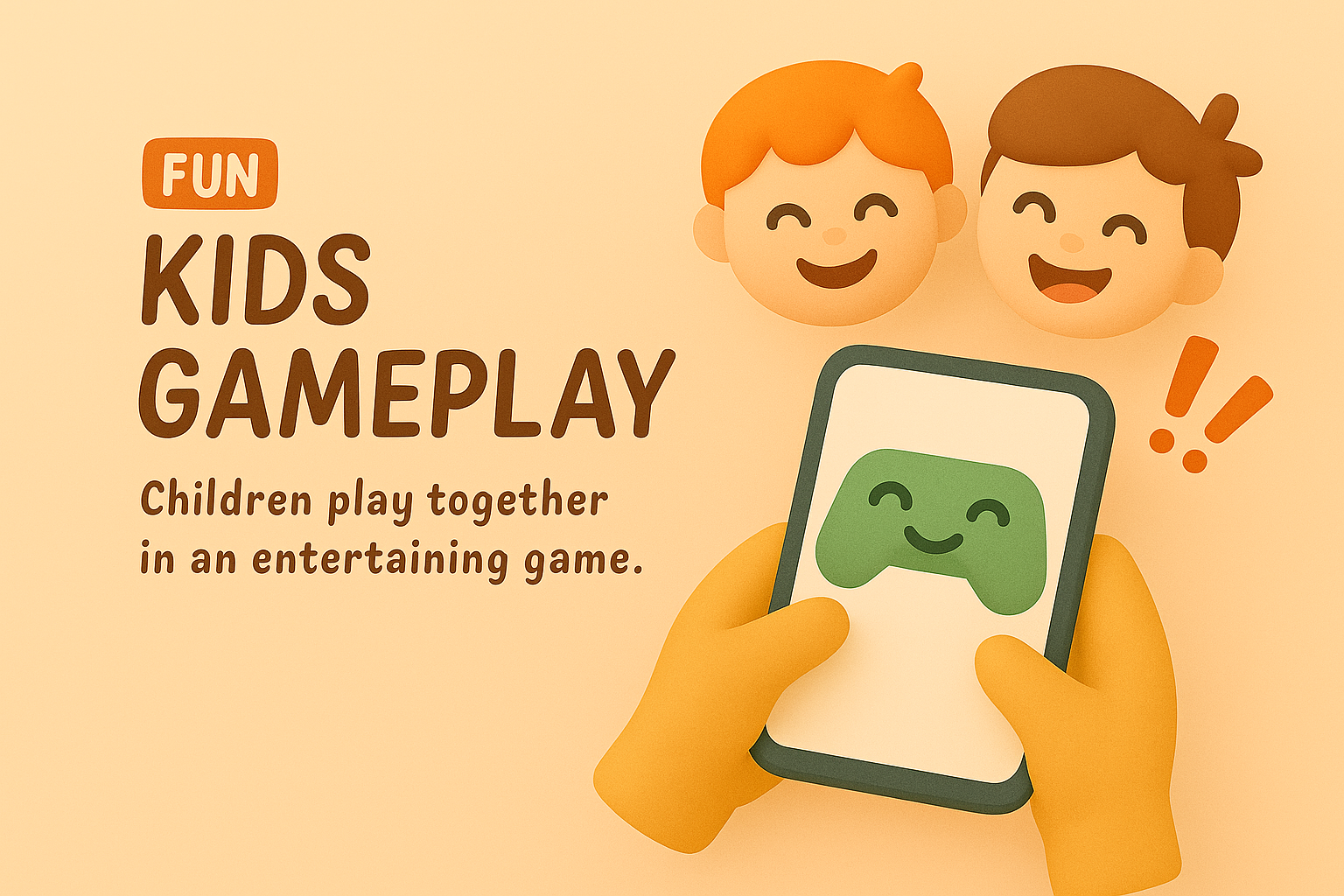 /Collection: /by davooda/Type: PNG/A vibrant illustration depicting children enjoying gameplay on a mobile device, ideal for promoting gaming content aimed at young audiences. The playful design and warm colors create an inviting atmosphere.