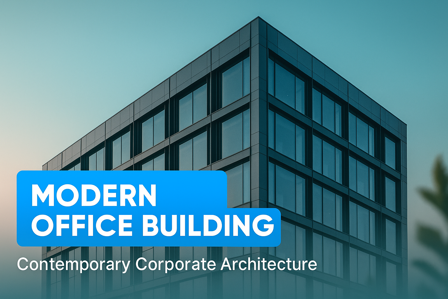 /Collection: /by davooda/Type: PNG/A striking modern office building showcases contemporary corporate architecture. The facade features large glass windows and sleek lines, presenting a professional appearance.