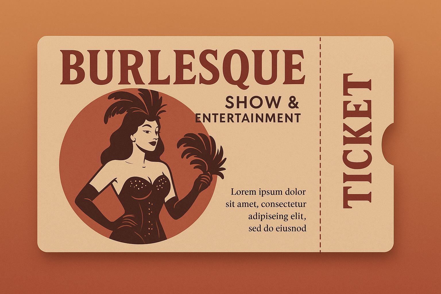 A visually engaging burlesque ticket featuring a woman in a feathered headdress, showcasing a warm color palette and clear typography. The design balances elements effectively.