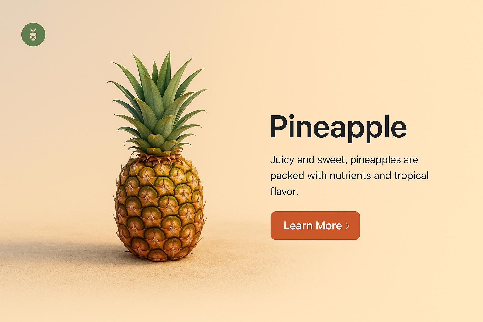A detailed 3D illustration of a pineapple set against a smooth gradient background. Text and a button complement the visual, inviting viewers to learn more about this tropical fruit.