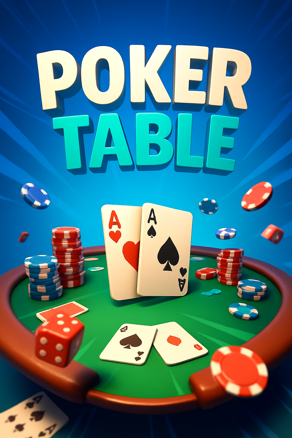 A vibrant 3D illustration of a poker table featuring playing cards, chips, and dice. The dynamic background radiates energy, enhancing the gaming atmosphere.