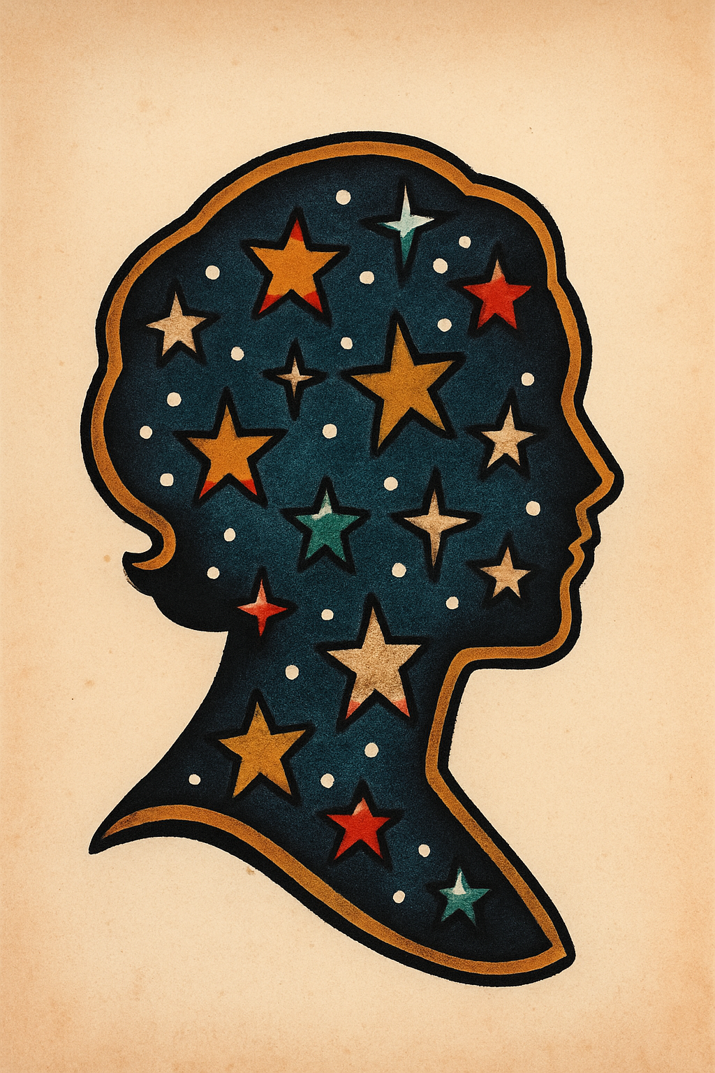 A tattoo design featuring a silhouette filled with colorful stars on a soft beige background. The intricate sketch showcases various star shapes in vibrant colors.