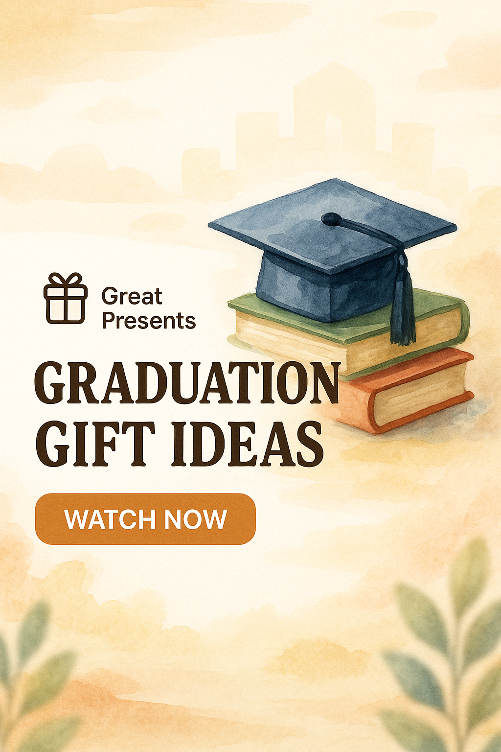 Charming promotional graphic featuring a graduation cap on books, designed in a watercolor style, ideal for celebrating graduation with gift suggestions.