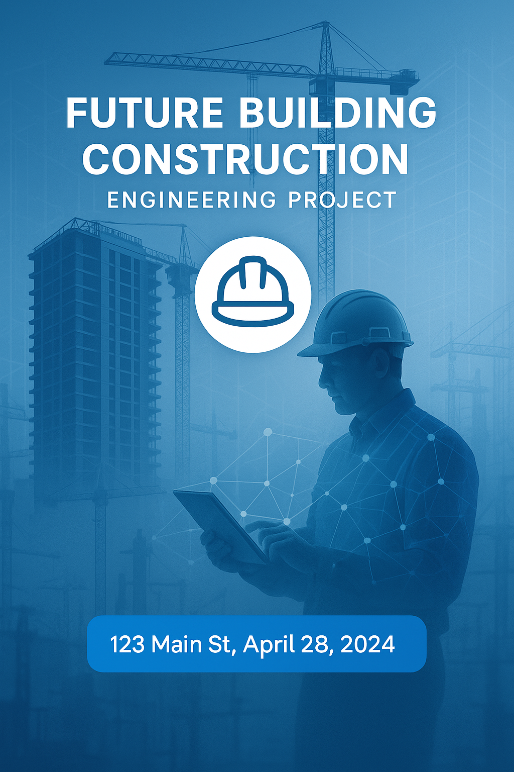 /Collection: /by davooda/Type: PNG/Professional graphic announcing a future construction project, featuring a silhouette of a worker in a helmet against a blue background with construction imagery, suitable for project presentations.