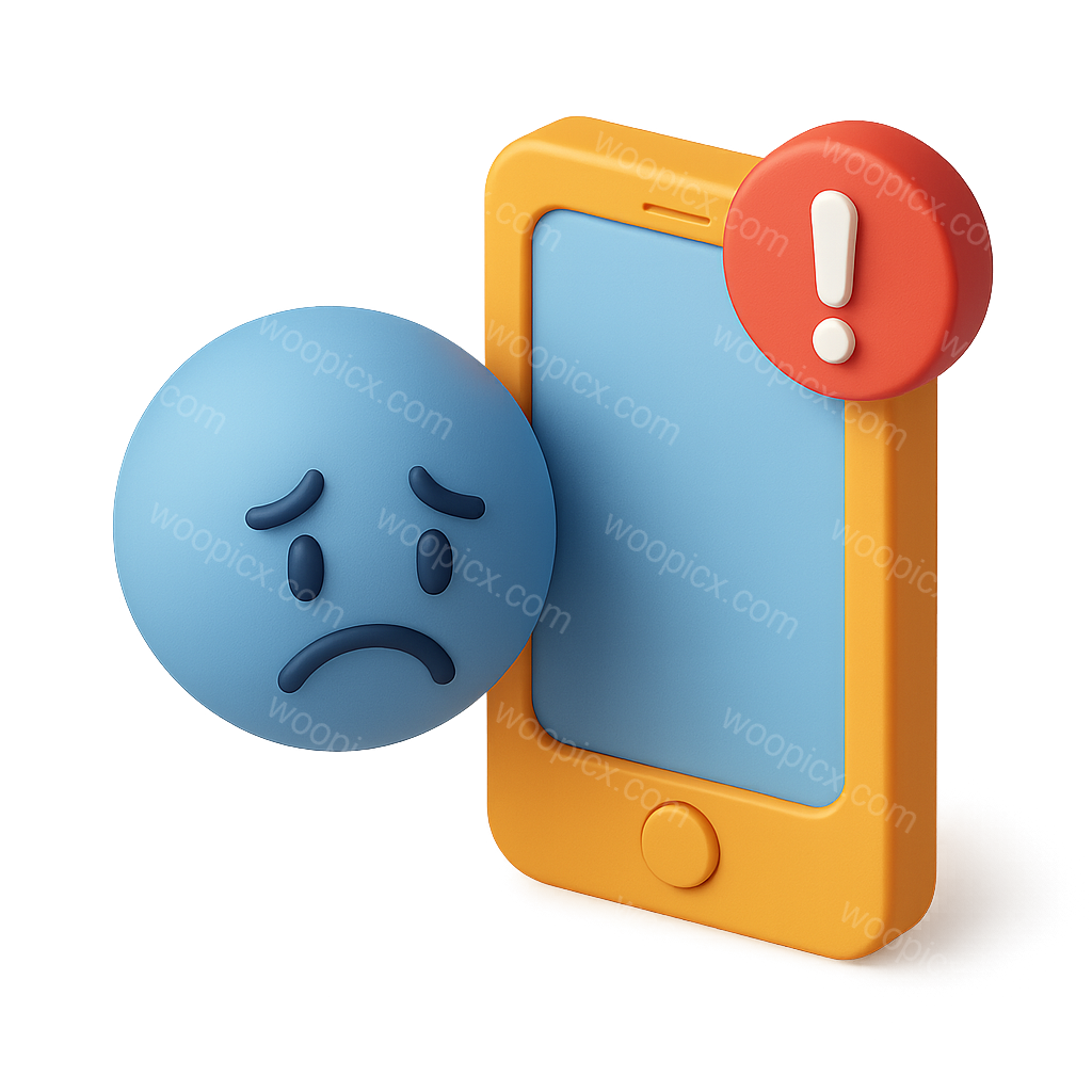 A 3D icon depicting a sad emoji next to a smartphone with an alert symbol. The design features a playful, volumetric style with a transparent background.