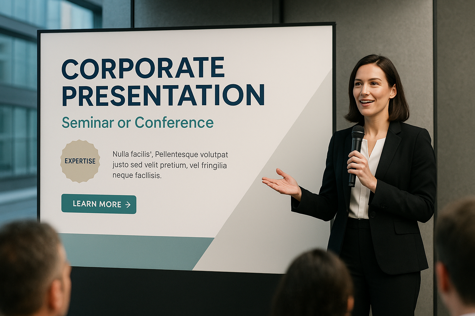 The image features a confident businesswoman delivering a presentation at a corporate seminar. She is engaged with the audience, showcasing her leadership and expertise in a professional environment.