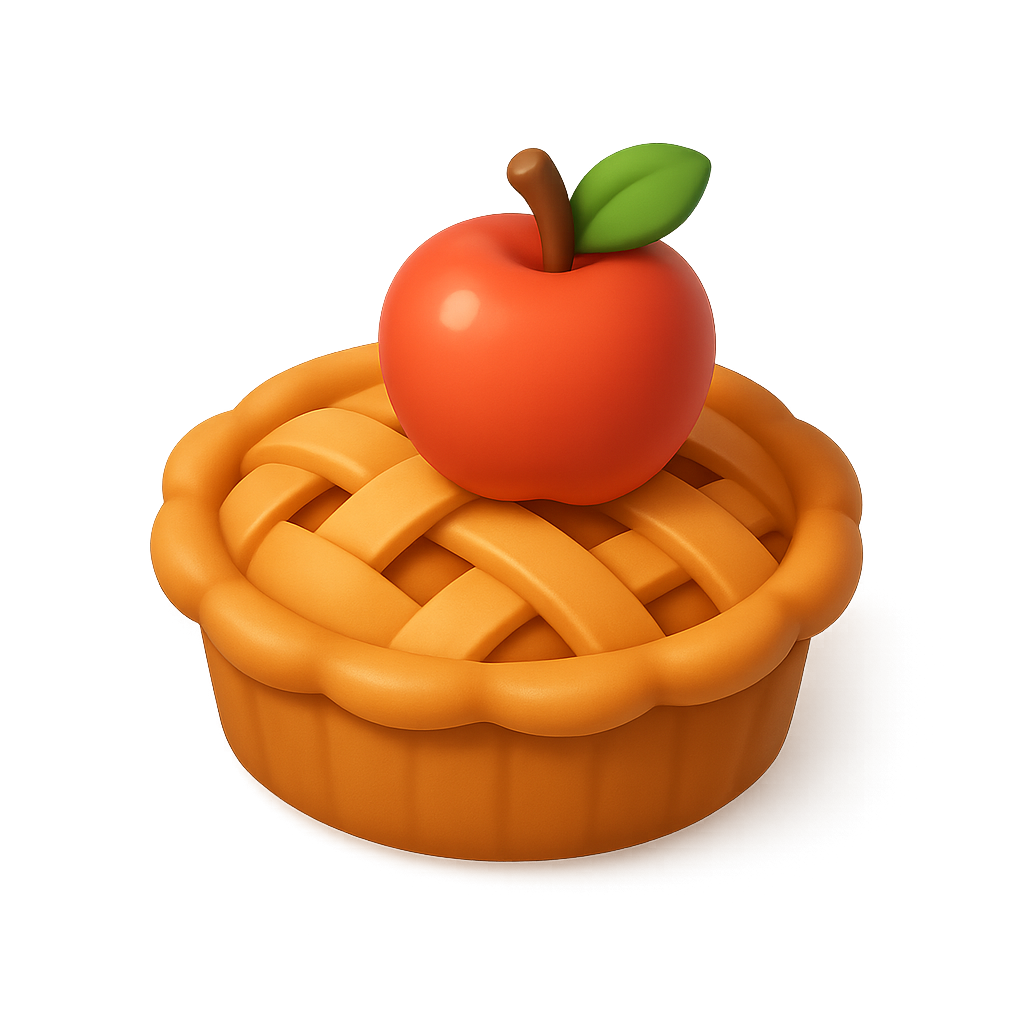 A vibrant 3D icon of an apple pie featuring a glossy red apple with a green leaf on top. The pie has a golden-brown crust and a woven lattice design.